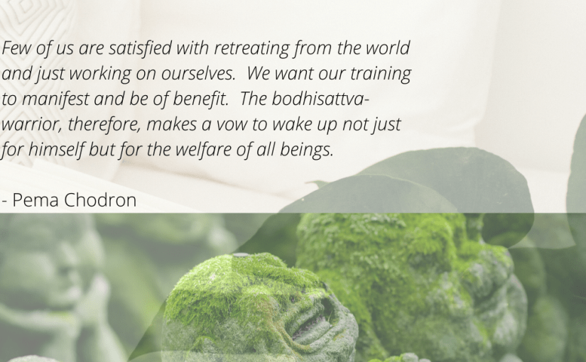 The bodhisattva is someone who vows to share the benefits of their meditation practice with all living beings. The suffering of others is not really separate from our own. We all know how one person’s rude remark can impact us – perhaps for a day – perhaps it triggers a deep-seated hurt. In turn, this can make us cranky towards others and so on it goes – a ripple effect of negativity. So when we choose to sit in meditation and get quiet – take a beat and sit with our emotions we may not feel the peace we desire immediately but it starts to move us there. There is an intention set in us to perhaps go out into the world again and to try and be kinder to those we come into contact with; to try and practice more patience and respect with each other. If we can help make someone else’s day less painful then they, in turn, will not be as likely to snap at the next person.